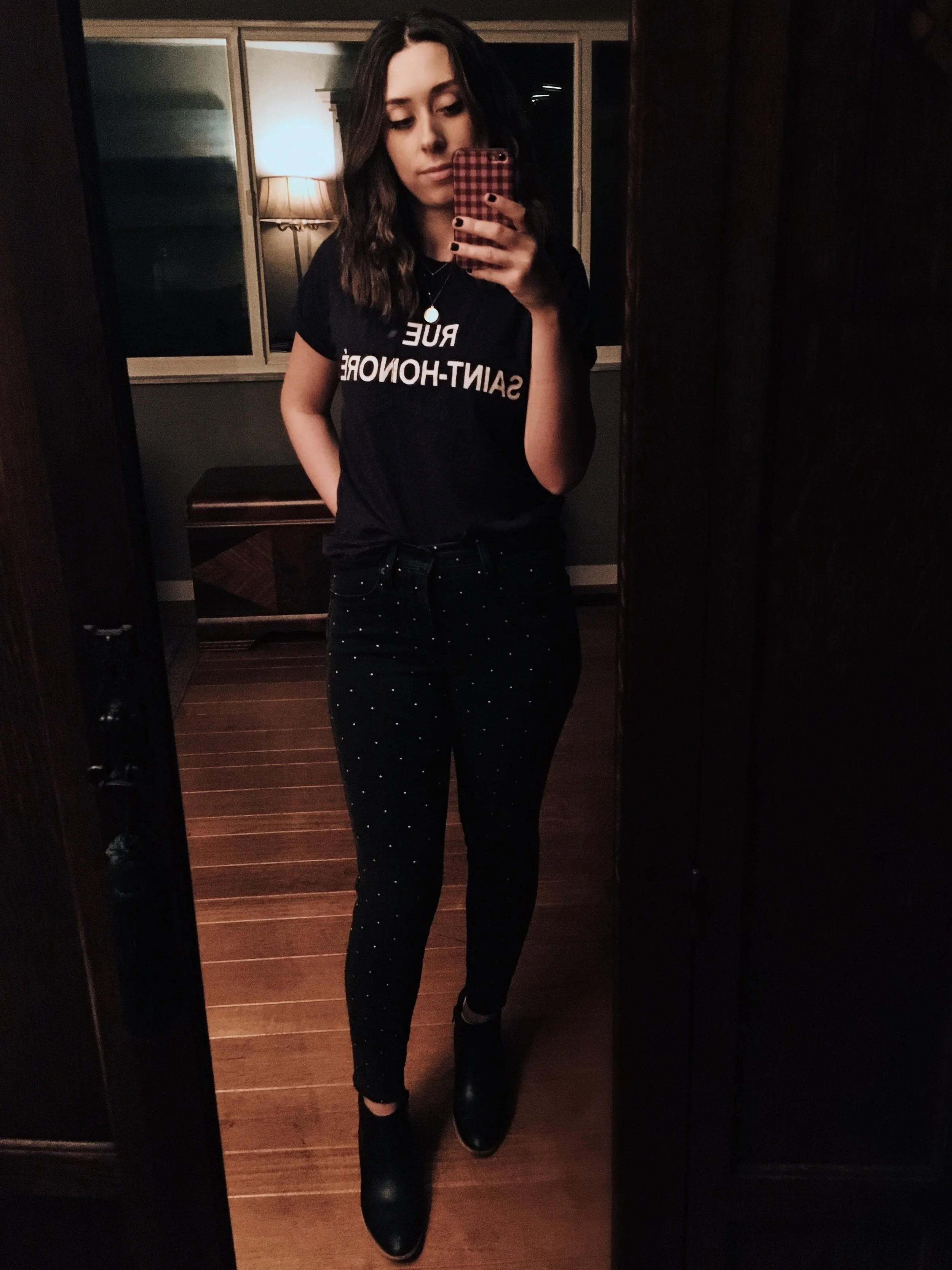 J.Crew ‘Rue Saint-Honore’ tee (similar here), Madewell Metallic dot high-rise jeans, J.Crew Initial necklace (similar here), Madewell Ankle booties (similar here)