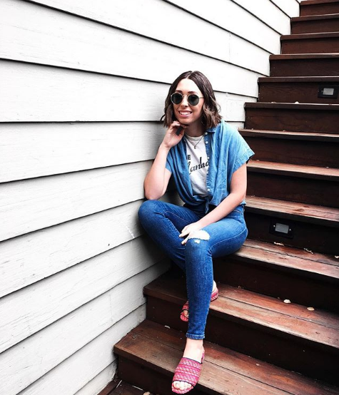 Madewell Chambray shirt, J.Crew ‘The Manhattan’ tee, J.Crew High-rise toothpick jeans (similar here), J.Crew Woven slides (similar here), J.Crew Initial necklace (similar here), Urban Outfitters Round sunglasses (similar here)